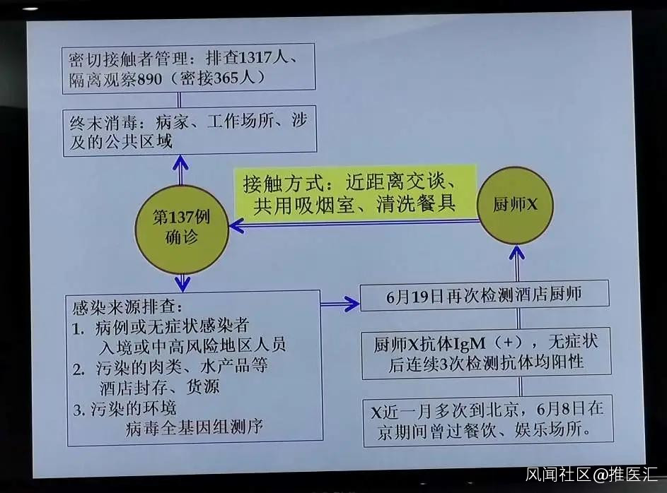 通過多次排查發現,該確診病例工作所在酒店的另一名廚師血清IgM陽性,該廚師近一個月曾多次赴北京,且在餐館、娛樂場所等公共場所長時間逗留,但此人至今未表現出任何症狀。