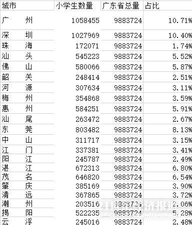 廣州、深圳的小學生數量在廣東省佔比最高,這與這兩地的常住人口在廣東省佔比最高的地位是一致的。