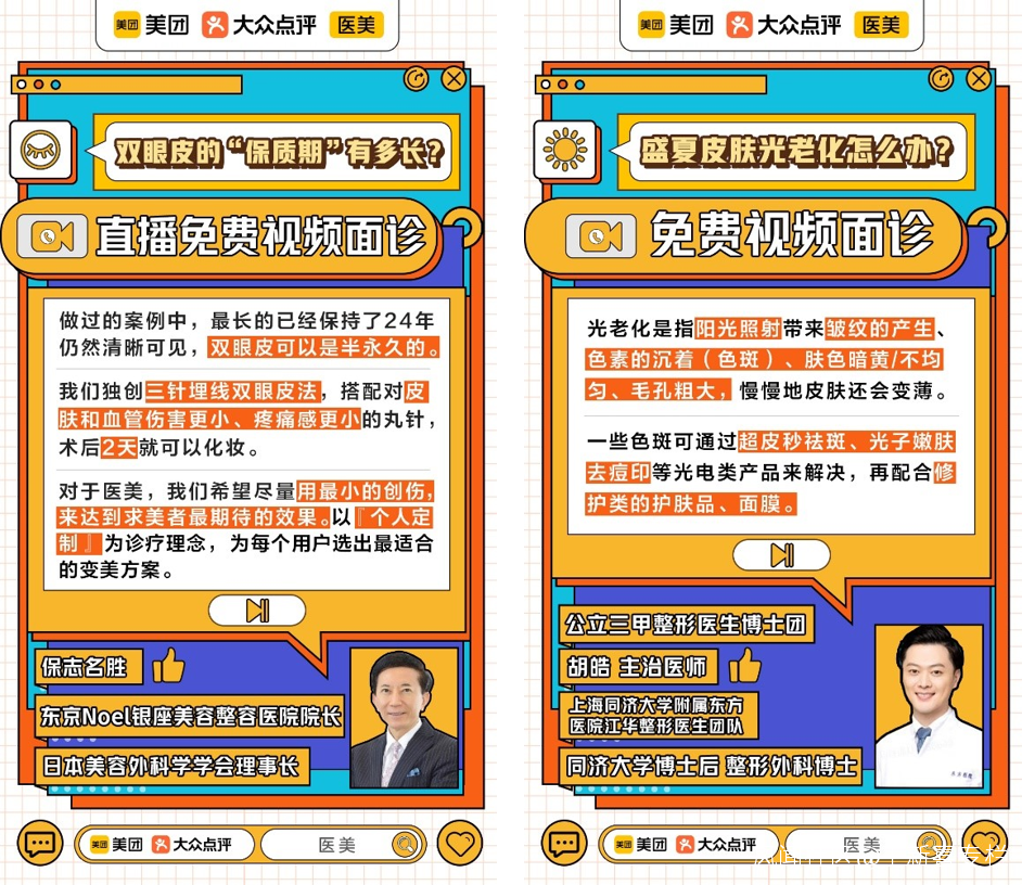 美團醫美618期間,包括公立三甲同濟大學上海東方醫院江華教授及其團隊、北京八大處整形醫院郭鑫副教授,以及日本東京Noel銀座美容整容醫院院長、日本美容外科學學會理事長保志名勝等海內外知名醫美醫生在線直播和免費視頻面診。