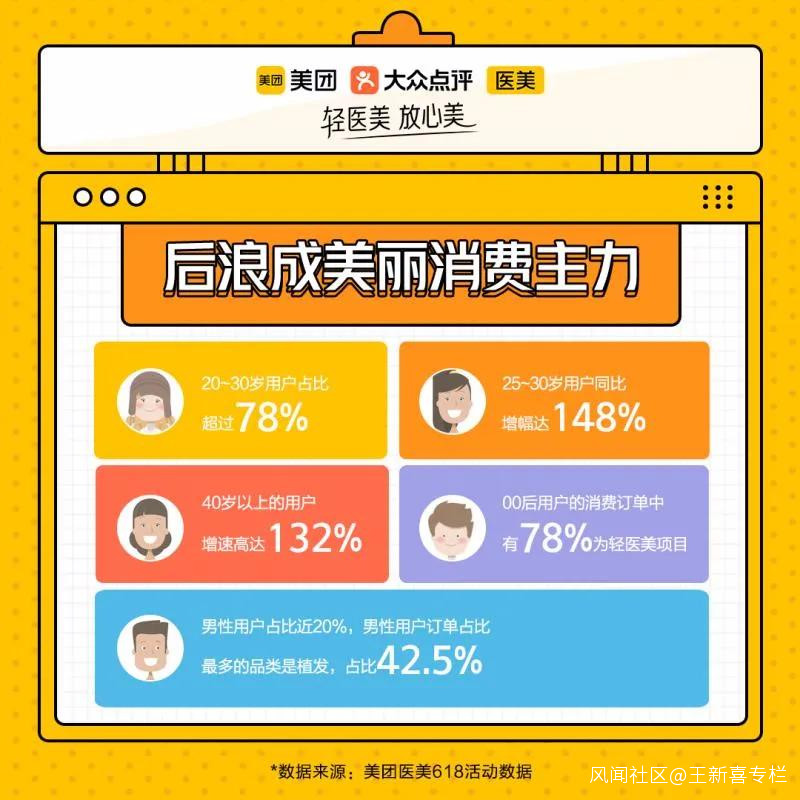 年輕人逐步成為醫美消費的主力。美團醫美《618美麗重啓消費報告》顯示,20~30歲的用户佔比超過78%。其中增速最快的羣體為25~30歲的95後,同比增幅達148%。95後們也開始有“抗初老”需求,抗衰老、除皺瘦臉、植髮項目的總訂單量中,有35%來自95後。