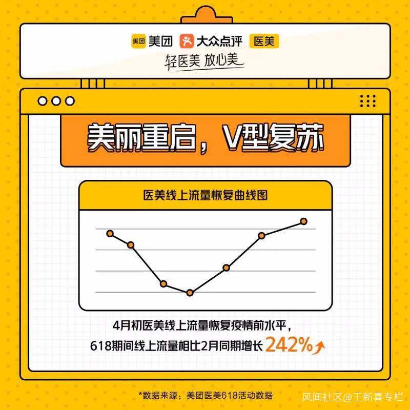 美團醫美《618美麗重啓消費報告》顯示,3月開始,醫美逐步呈現復甦趨勢,從線上流量看,4月初即已恢復到疫情前水平。618活動期間線上流量比2月同期增長242%,行業呈現明顯的“V型復甦”趨勢。