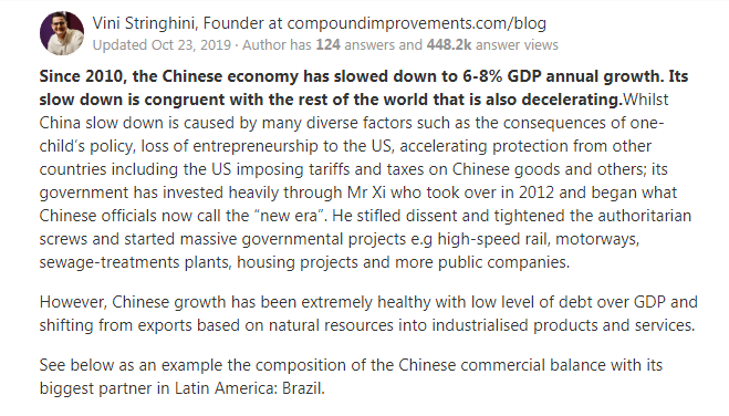 自2010年以來,中國經濟已放緩至6-8%的GDP增速。中國的減速與世界其他地方的減速是一致的。而中國經濟放緩是由多種因素造成的,如獨生子女政策帶來的後果、創業人才流向美國、其他國家的加速自我保護,其中就包括美國對中國商品和其他國家的商品徵收關税;中國ZF在2012年後進行了大量投資,開啓了中國官員所謂的“新時代”。並啓動了大規模的政府項目,例如:修建高速鐵路、高速公路、污水處理廠、住房項目,以及投資了大量的上市公司。
