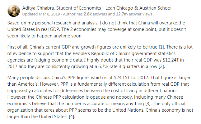 首先,中國目前的GDP和增長數據可能不是真的[1]。有很多證據可以證明,中國ZF的統計機構偽造了經濟數據。我非常懷疑他們2017年的實際GDP真的有12.24萬億美元,並且他們已經連續三個季度保持6.7%的速度增長了[2]。