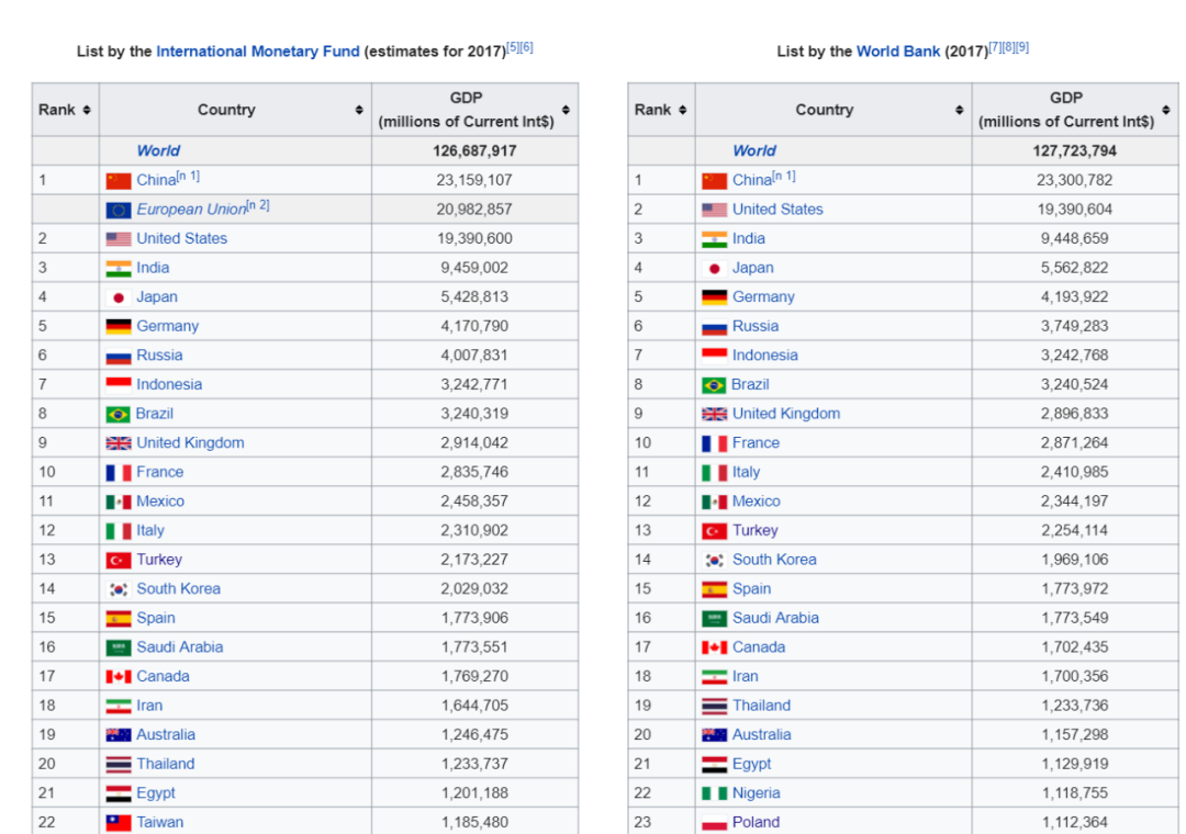 很多人討論中國的購買力平價GDP,2017年中國的購買力平價GDP為23.15萬億美元。這個數字比美國還要高,然而,購買力平價是一個與真實GDP完全不同的計算方式,後者被認為是計算不同國家生活成本差異的方法。然而,中國的購買力平價計算是不透明的,包括許多中國經濟學家在內,沒人相信這個數字是準確的,或者有什麼意義[3]。唯一關心購買力平價的官方組織是聯合國。中國的經濟規模並不比美國大[4]。