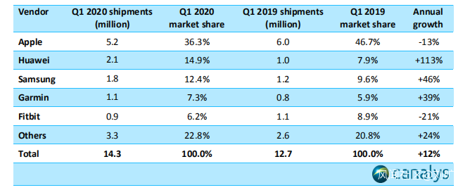 據市場調查機構Canalys公佈的最新報告顯示,2020年第一季度全球智能手錶出貨量為1430萬塊,同比增長12%。其中,蘋果依舊穩居第一的位置,而華為則逆勢實現同比增長到113%,市場份額為14.9%,其智能手錶出貨量達到了210萬塊,超越三星成為全球第二。