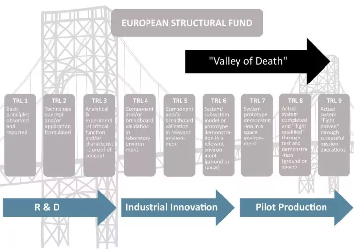 歐美的政府使用TRLs(技術準備水平)來提供資金。TRLs起源於20世紀60年代,當時美國宇航局開發它來描述他們在發展空間計劃的位置。TRLs 1-3是真正的概念性研究,所以在空間計劃的情況下,TRL 1應該是肯尼迪總統説的,他們將送人到月球,並在十年內安全返回;TRLs 4-6將是原型和飛行測試階段;TRLs 7-9是最後一次飛行前的所有檢查。這些水平正被用於製造業,尤其是美國和歐洲政府,以瞭解它們將資金投向何處。