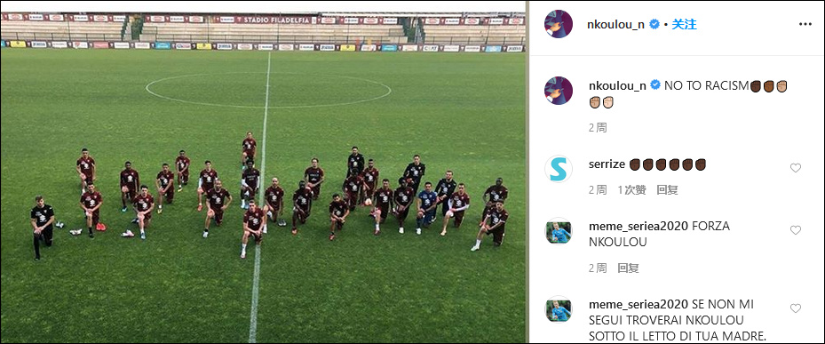 原來,都靈隊選的這張圖,看上去像恩庫魯在向一名白人球員(意大利國腳佩洛蒂)下跪。這下可好,原本用傳達積極信息的推文,成了眾矢之的。