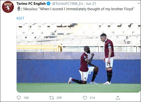 賽後,都靈隊將一張恩庫魯跪地的照片上傳至推特,並配文,“恩庫魯:‘當我進球的時候,我第一時間想到的是我的同胞弗洛伊德’。”