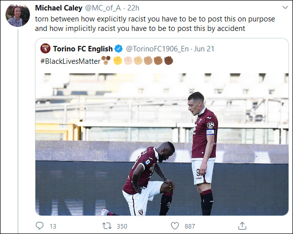 然而,都靈隊卻在大部隊中“翻了車”,原本呼籲種族平等的推文,反而被認為是在暗地裏表達種族歧視。