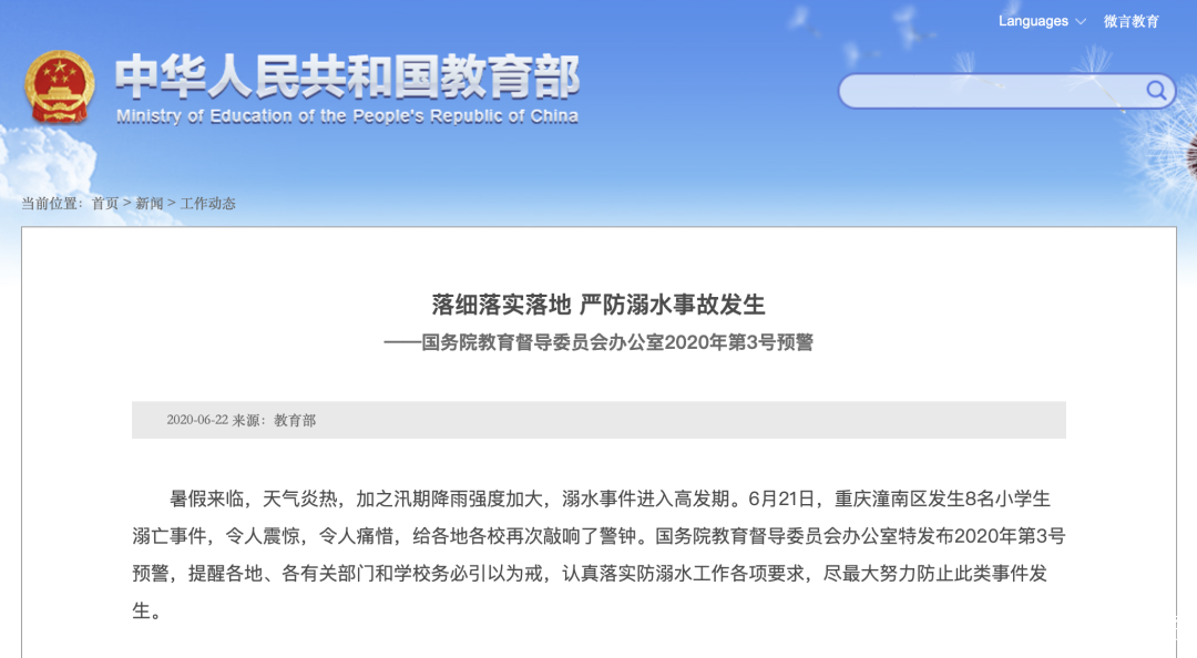 暑假來臨,天氣炎熱,加之汛期降雨強度加大,溺水事件進入高發期。**6月21日,重慶潼南區發生8名小學生溺亡事件,令人震驚,令人痛惜,給各地各校再次敲響了警鐘。**國務院教育督導委員會辦公室特發佈2020年第3號預警,提醒各地、各有關部門和學校務必引以為戒,認真落實防溺水工作各項要求,盡最大努力防止此類事件發生。
