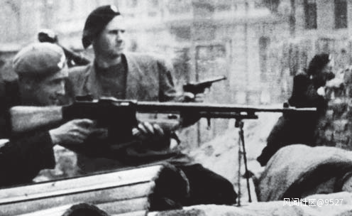 1944年在法國馬賽街頭戰鬥的法國士兵,有幸獲得了BAR。由於BAR的短缺,許多法軍被配發了湯普森衝鋒槍,事實證明這種衝鋒槍是自動步槍的不良替代品。照片上的BAR似乎有一個早期風格的兩腳架。