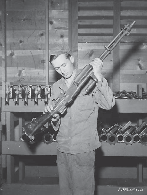 1951年8月,第63步兵連裝甲師羅伯特-斯特雷德(Robert Straede)一等兵在加州奧德堡檢查新修好的BAR,然後才能重新發給戰場上的部隊。朝鮮戰爭時期的BAR相當統一,但在二戰期間,各種型號和配置的BAR都能見到。有時一支 “現代化 “的M1918A2會送去軍械廠維修,回來時帶着全新樣式的前護木,使它除了加裝彈匣導板外,看起來就像二戰時期生產的BAR。