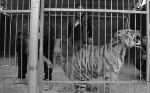 而被虐待的老虎只能縮在籠子的一角,躲避,掙扎,屈服。