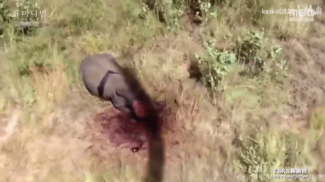 躺在草地中的犀牛失去了半邊臉,鮮血從傷口不斷流出,染紅了周圍的土地。