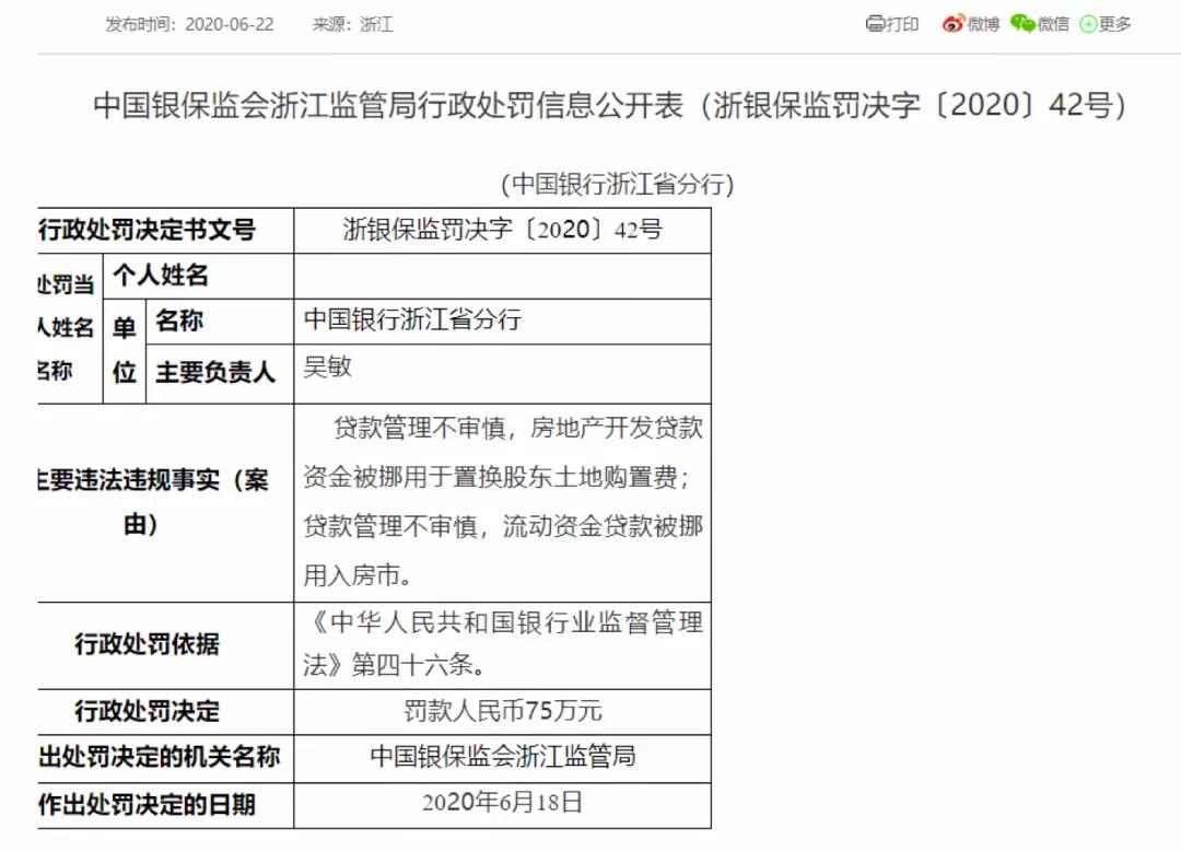 中國銀行浙江省分行因存在貸款管理不審慎,房地產開發貸款資金被挪用於置換股東土地購置費;流動資金貸款被挪用入房市的違法違規行為,浙江銀保監局對其予以罰款75萬元。