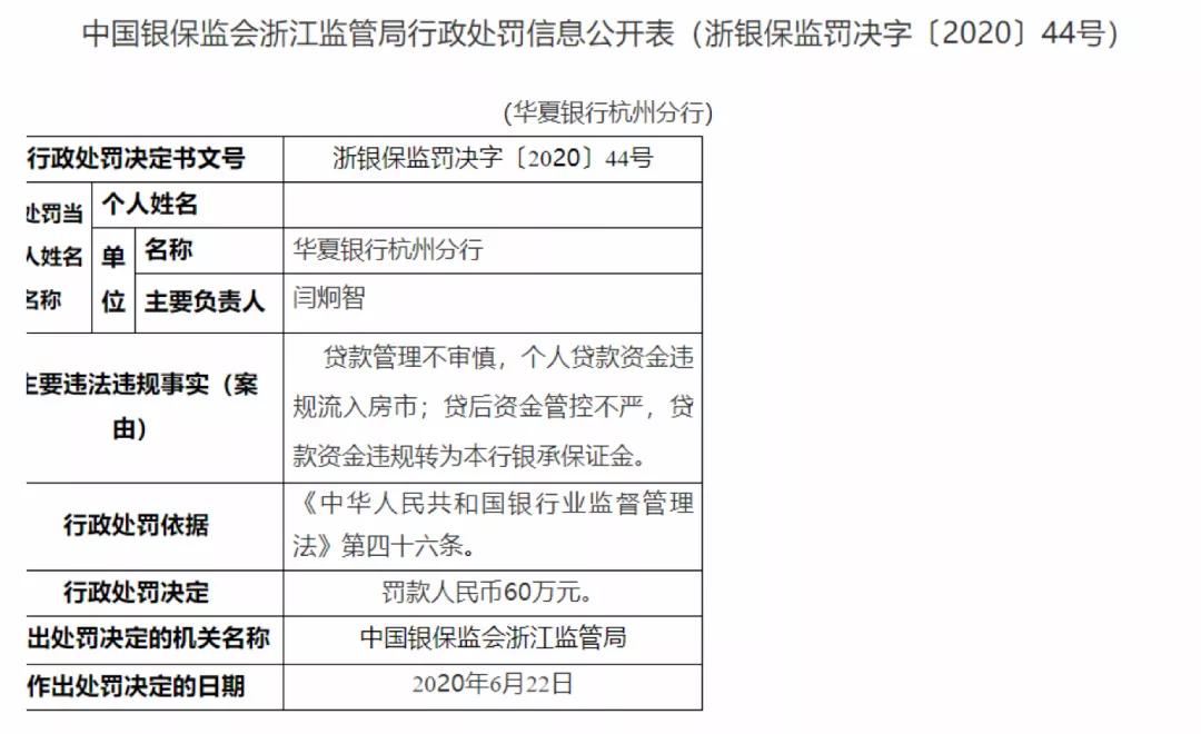 6月23日,浙江銀保監局公開披露,華夏銀行杭州分行1張罰單,被罰60萬元。
