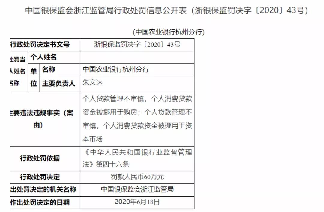 此外,同日被罰的農業銀行杭州分行因存在個人貸款管理不審慎,個人消費貸款資金被挪用於購房;個人消費貸款資金被挪用於資本市場的違法違規事實,被處以60萬元罰款。