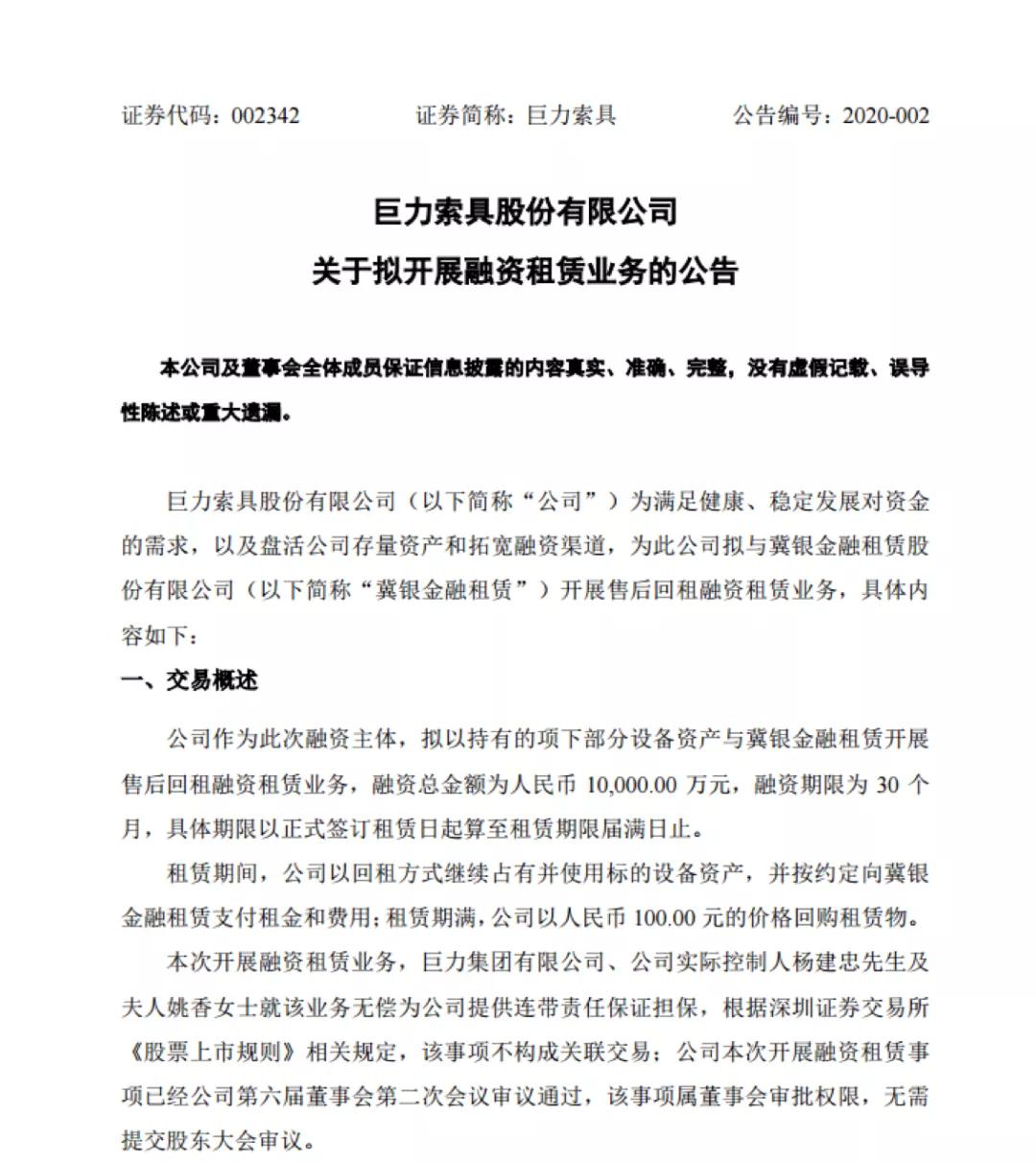 具體而言,巨力索具作為融資主體,擬以持有的項下部分設備資產與冀銀金融租賃股份有限公司(下稱“冀銀金融租賃”)開展售後回租融資租賃業務,融資總額1億元,期限30個月。