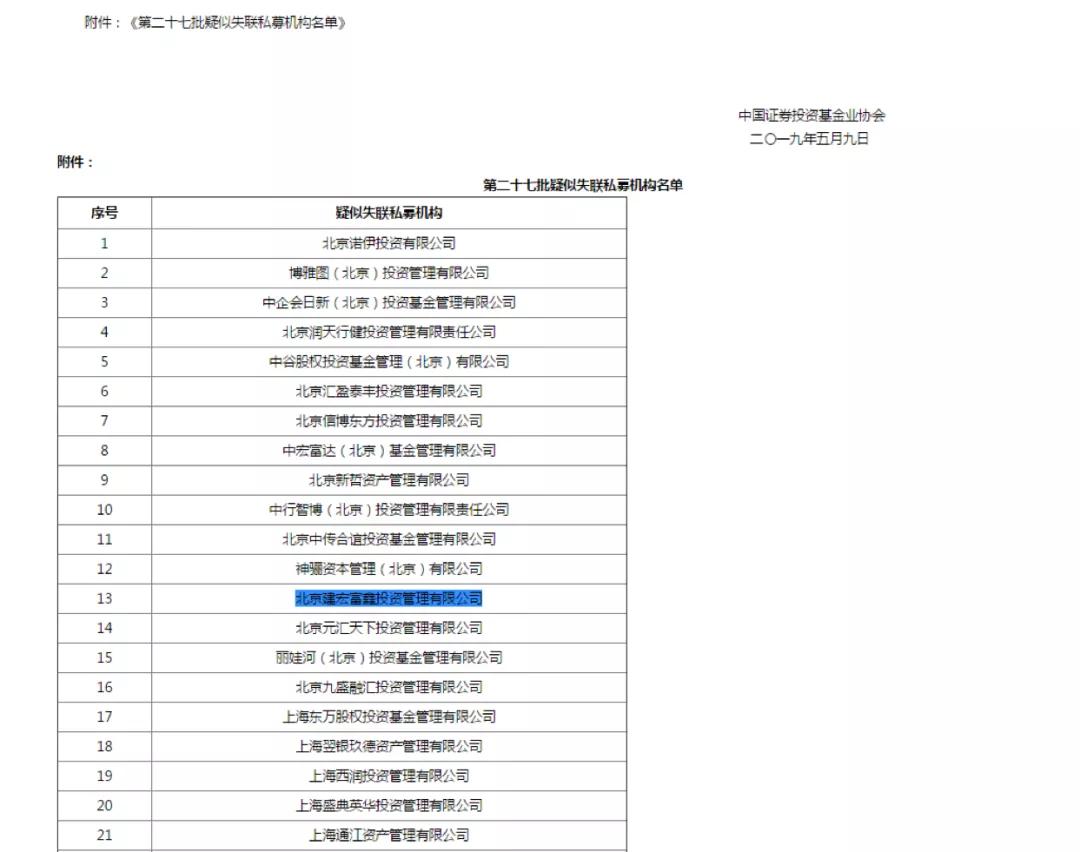 據中國證券投資基金業協會於去年5月下發的《關於失聯私募機構最新情況及公示第二十七批疑似失聯私募機構的公告》顯示,建宏富鑫被列入疑似失聯名單中。