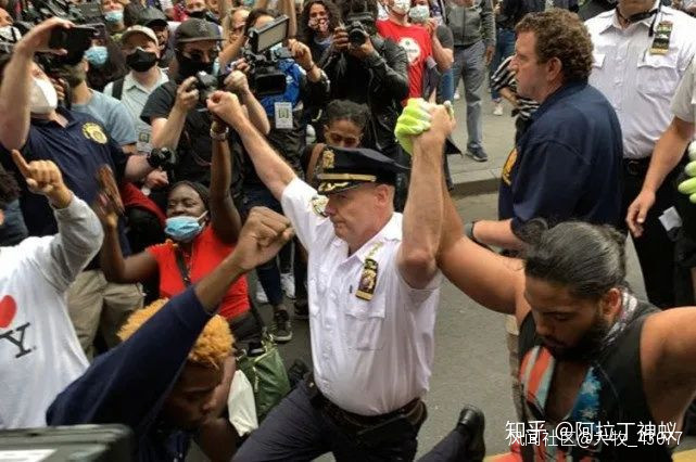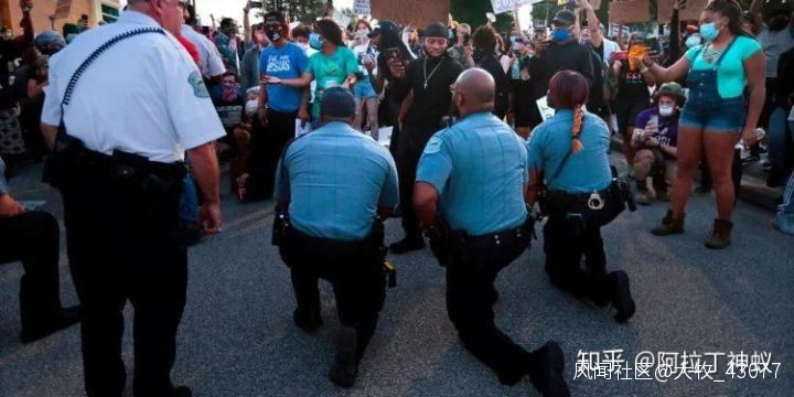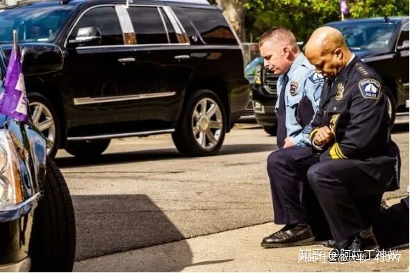 弗洛伊德追悼會,包括當地警察局長在內的所有警察,跪地迎靈車。這次所有人是被上級要求下跪的,有警察因為不滿而辭職。