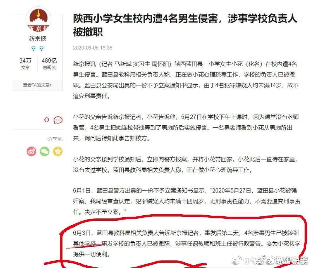 藍田小學女生被四名男同學性侵害。新京報説四個男生被轉到“其他學校”。其實四個男生是被轉到“工讀學校”。這差別很大。前去採訪的記者肯定知道這個信息,騰訊新聞就如實報道了“工讀學校”。但是新京報就是第一時間傳遞模糊的信息。