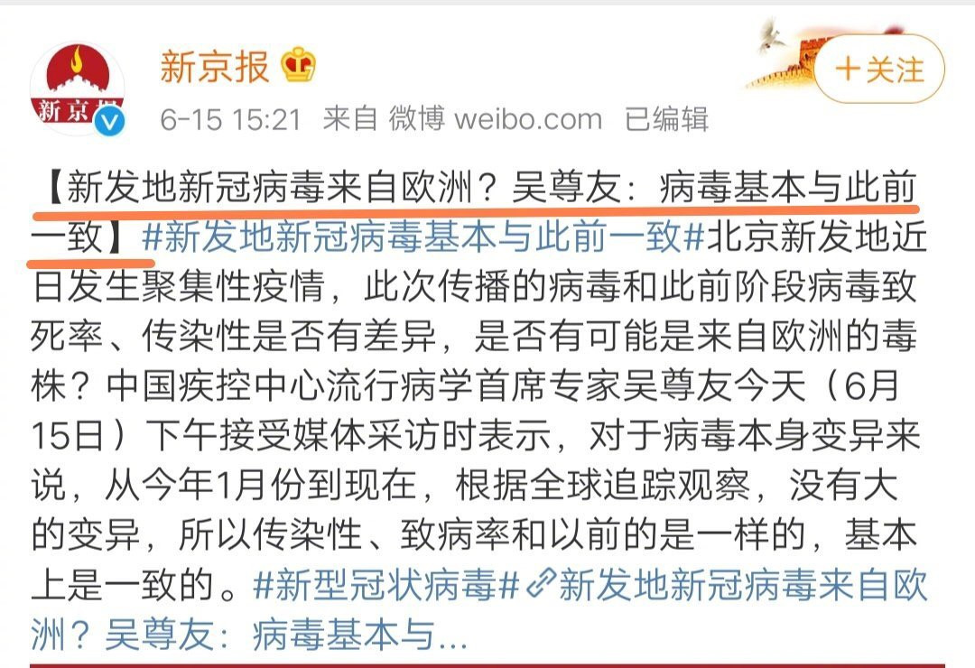 到了新京報這裏,新聞標題直接否定病毒來自歐洲。説病毒與北京之前毒株一致。同一個採訪對象,同一個採訪內容,完全不同的報道。