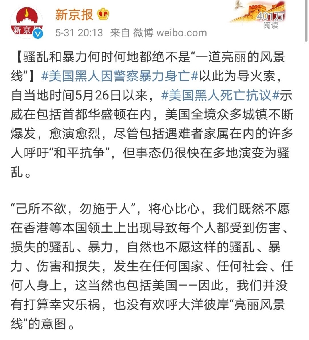 之前美國眾議院院長佩洛西説發生在香港的打砸搶燒活動是“美麗的風景線”。然後美國今年發生了因黑人被警察跪壓致死而引發的大範圍抗議活動時,網友要把“風景線”一詞還給美國。新京報坐不住了,立刻跳出來“教育”我們。