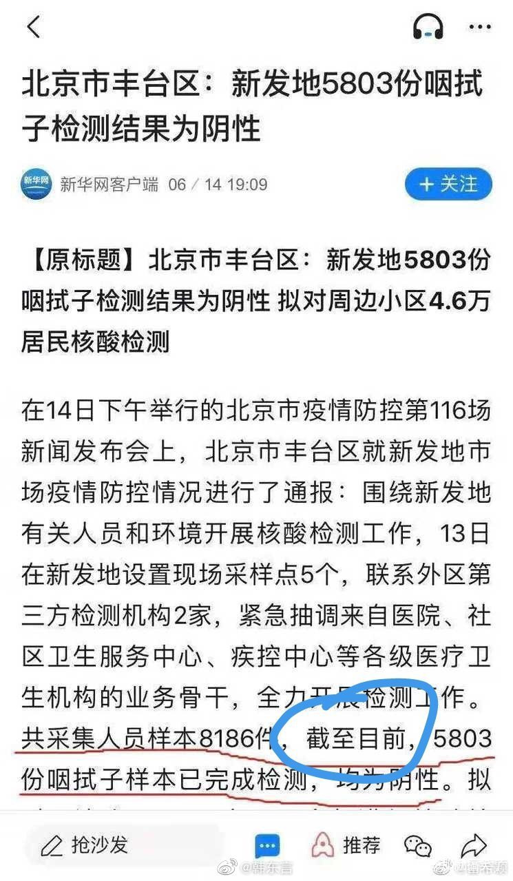 新京報在核酸樣本的檢測新聞報道角度又很奇怪。新華網的新聞是8186件樣本被採集,截止到目前(新聞發稿時),5803份已完成檢測,均為陰性。這表示剩下2383份還沒有出檢測結果。