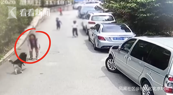 通過小區監控畫面可以看到,在狗咬人之前,有一位老人試圖抱住狂奔的哈士奇,但是被掙脱了。當哈士奇撲向孩子們的時候,老人就站在一旁。