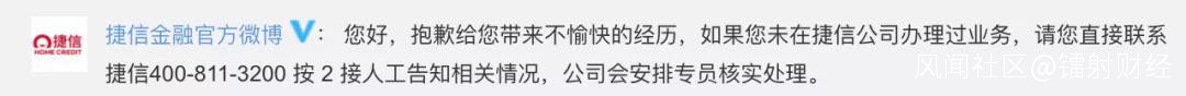 捷信對此回覆稱,“如果您未在捷信公司辦理過業務,請您直接聯繫捷信400-811-3200 按 2 接人工告知相關情況,公司會安排專員核實處理”。但用户質疑,捷信在撥打電話前未審核清楚,為何需要用户在被騷擾後主動聯繫並解釋。