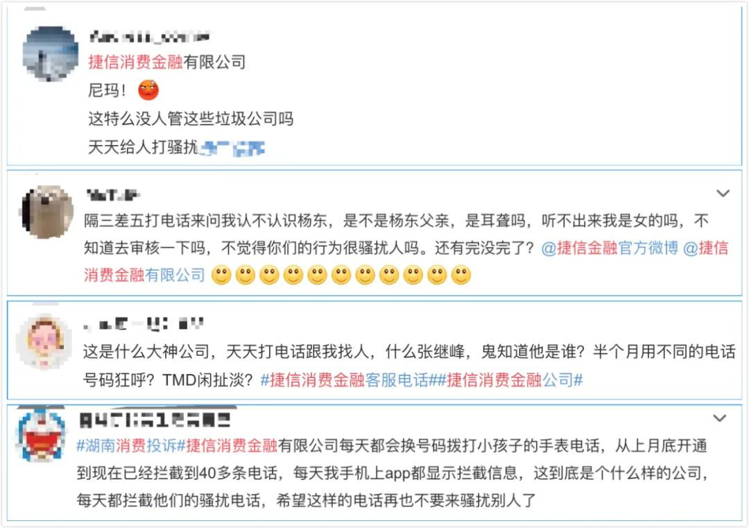 其中,風控審核方面的短板,是決定一家消金公司能夠構建起核心競爭壁壘的關鍵。鐳射財經注意到,今年6月以來,不少用户在微博等社交平台上表示,被捷信頻繁撥打騷擾電話,並被錯認為某人,在用户明確表示真實身份後,仍然繼續收到捷信方面的來電。