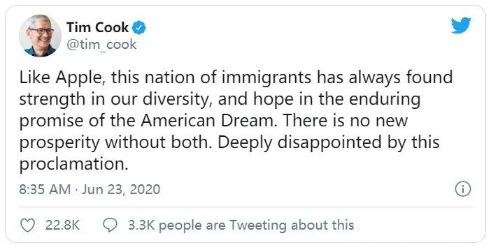 蘋果首席執行官蒂姆·庫克(Tim Cook)在一條推文中説,他“對這一宣佈深感失望”,並説:“像蘋果公司一樣,這個移民國家一直在我們的多樣性中找到力量,並希望美國夢能繼續實現。沒有兩者,就沒有新的繁榮。”