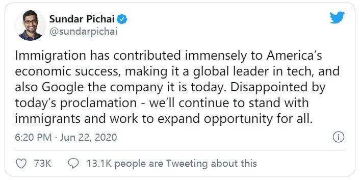 Alphabet首席執行官皮採(Sundar Pichai)本人就是移民,他22日發推表示:“移民為美國的經濟繁榮做出了巨大貢獻,使其成為技術領域的全球領導者。谷歌公司之所以有今天,也離不開移民的貢獻。”