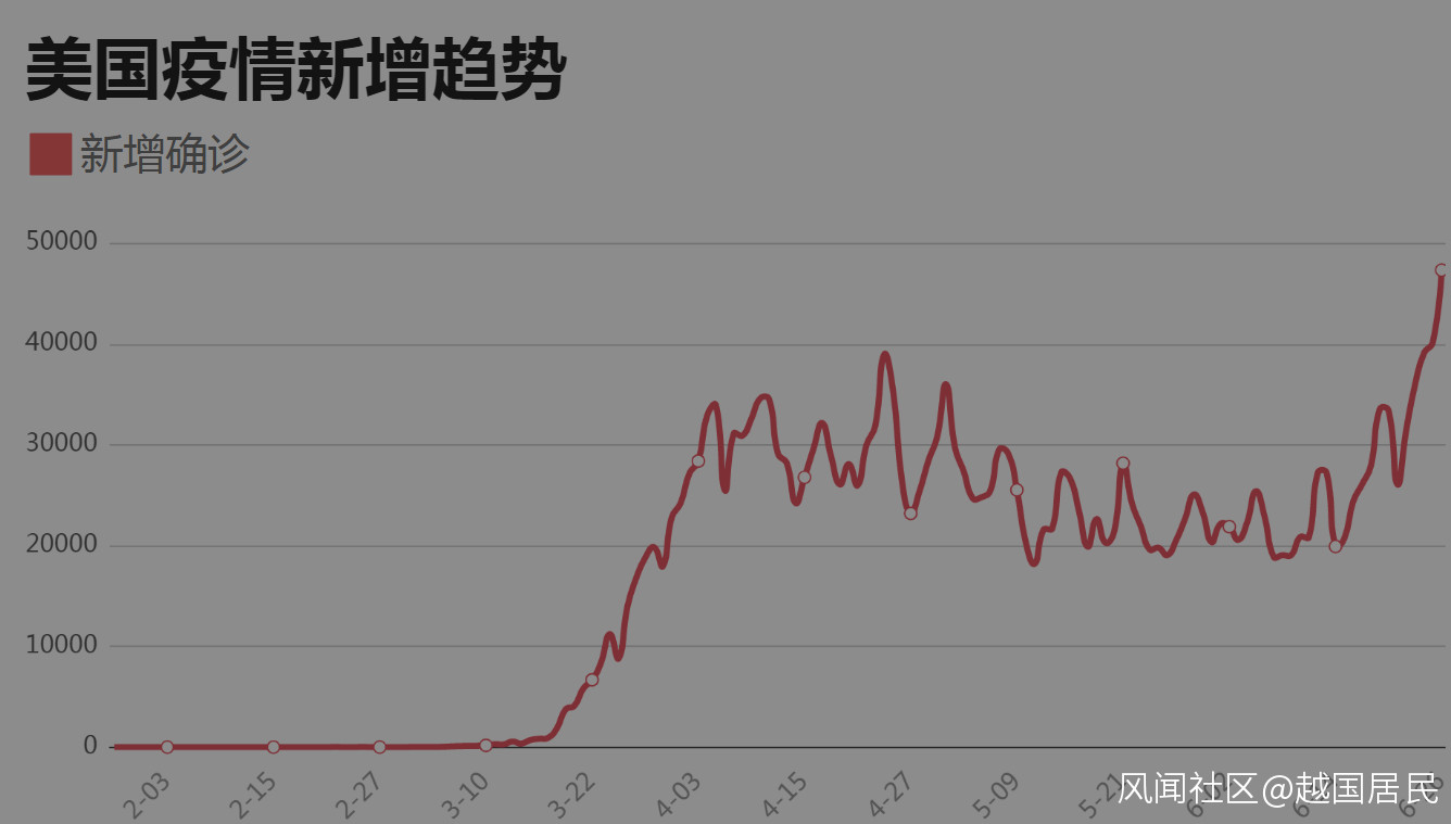 一般地説,新的傳染病第二波弱於首波,是因首波人們對新病無知和不知如何預防而傳播較重,再次出現,國家已採取了措施,民眾知道了防預,所以,一般只首波的40--60%,甚至更輕。也就是美國二波上升到首波頂峯,4萬以下已經“足量”了。我給出的5萬,充分考慮了美國的動亂和不合事宜的復工復產帶來的風險,但是現實更加嚴重。到7月4日可能已超6萬,而上升期也可能延長至11日,峯位可能出現在7.9--8.5萬之間。