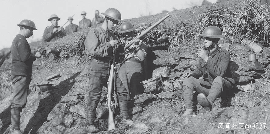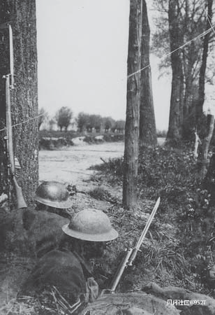 1918年,英國士兵在萊斯戰役中等待接近的部隊。固定刺刀從根本上影響了步槍的精度,作戰士兵一般都不願意安裝刺刀進行射擊。儘管如此,“上刺刀 “的命令仍然被廣泛認為是一種士氣的鼓舞。