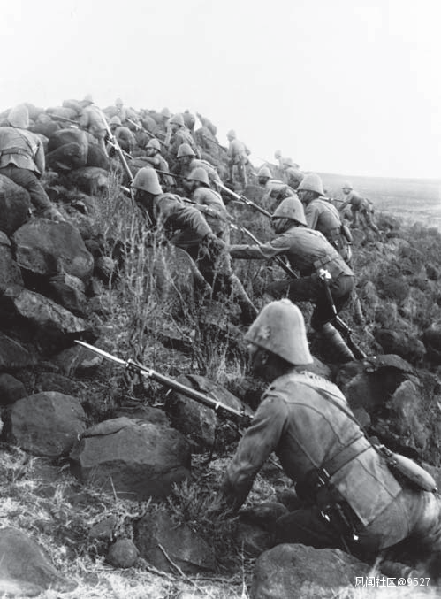 我們遭到布爾人的射擊… …從一個如此遙遠的地方我們看不到他們。我們的騎兵下了馬,從劍鞘裏拔出卡賓槍,但無力回擊,因為無法確定是從什麼時候開始的猛烈射擊。騎兵開始倒下,馬匹受到驚嚇,一個接一個地被擊中,上校命令他們到一些低矮的山丘後面尋找安全掩護。士兵們躺下了……不久,第一批步兵趕到了,但儘管他們的軍官使用瞭望遠鏡,但麻煩的布爾人的下落仍然是個謎。
