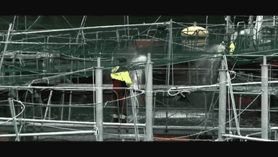 養殖場工人向三文魚網箱裏噴灑殺蟲劑。圖據ARTE