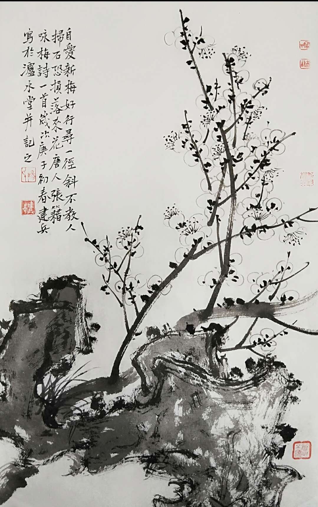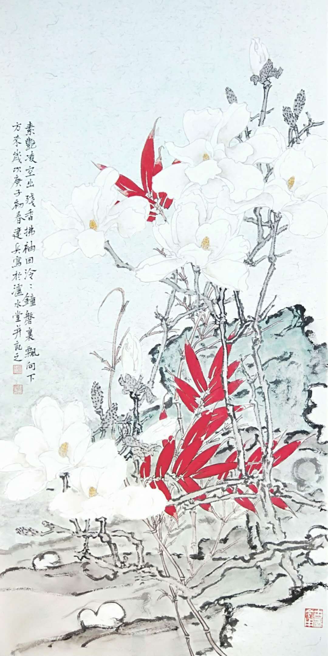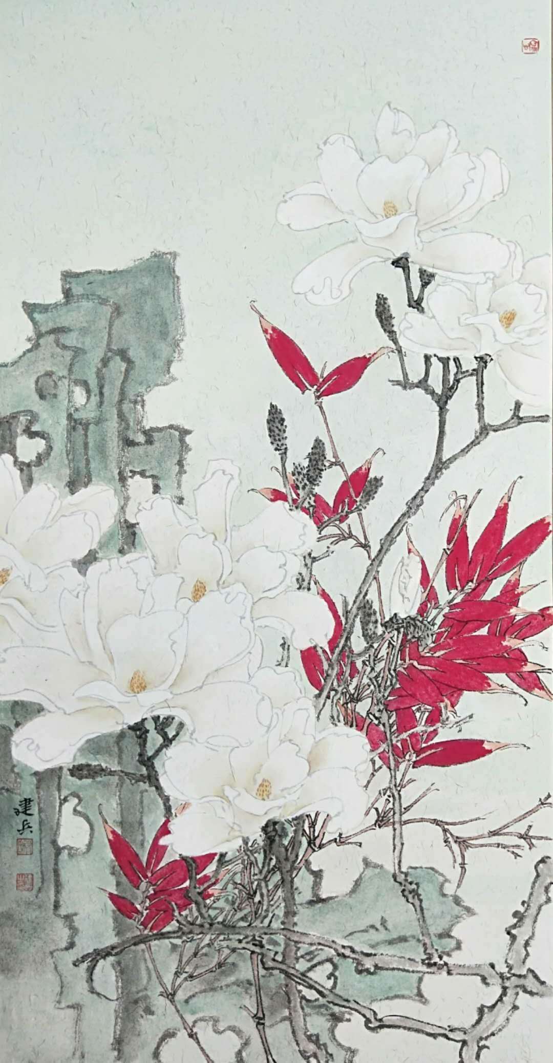“一分耕耘,一分收穫”。最重要的就是不要去看遠方模糊的,而要着手做眼前清楚的現實的事。在杭州學習期間,有一件事讓楊建兵無法忘記一——中國美院每一年都會有兩季的學生優秀作品展賣會。楊建兵在2011年秋季學生優秀作品展賣會的時候,作為班上兩名學生之一送去了自己的三幅花鳥作品進行展賣,結果三件作品都售出,收穫六千多元。這也是他人生第一次出售自已的作品。當時他欣喜若狂,自己的作品終於得到別人的認可與肯定,還能換來″真金白銀″。這是他沒想到的!學習結束返家時,他將賣畫款及身上餘款一併買畫冊花費近兩萬餘元。“欲窮千里目,更上一層樓”。他要更加勤奮地學習,充電,汲取前人的營養,讓事業之車開得更快更遠!