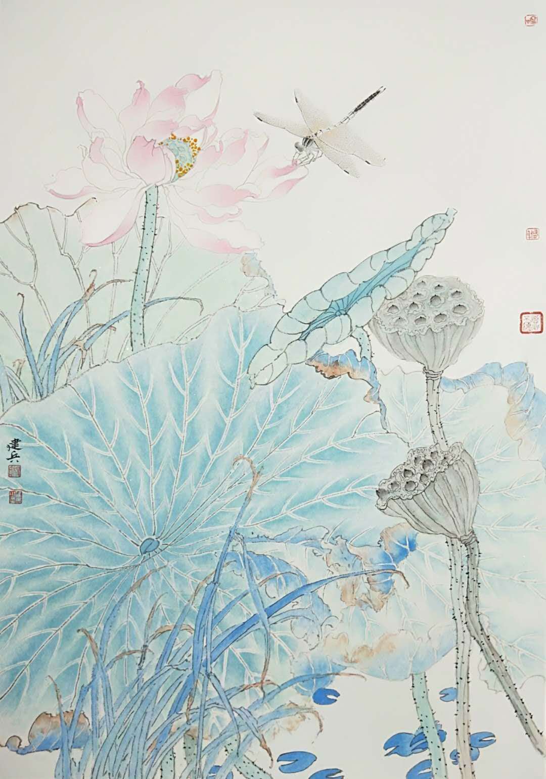楊建兵的創作在不斷完善,每幅畫都是經過苦心構思,精心佈局,絕不遊戲筆墨。他手上功力紮實,用心專注。他的畫,筆墨入微,意趣高遠,給人以天然渾成,匠心獨具的審美感受。他不但繼承了傳統繪畫的精髓,而且把鮮明的時代特色融入畫面。現實生活中,每個畫家既有適合市場需求的作品,也有代表其個性與符號的作品。他的《網系列》、《醒系列》作品等。其畫面色墨相依,虛實相襯,線條勁挺且重骨力與顏色渾然一體,沒有火氣、濁氣。欣賞這一系列畫作,無不讓人有所觸動,勾起生活中曾經那一幕幕感人的畫面。《荷韻系列》《春韻系列》作品強調對生活的理解與再現,具有濃厚的生活氣息。藉助其沉穩的底色,烘托出畫面的整體效果,用線蒼勁有力,畫面含蓄且令人遐思,和諧統一且清新自然。