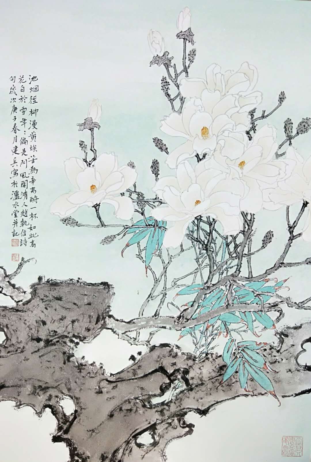 在杭州中國美術學院學習的時候,胡進曦老師的教學理念對他觸動很大,胡老師作品屬文人兼院體一路,純淨雅緻,穆如清風。楊建兵好幾次帶着自己的作品去胡老師杭州河坊街的家裏請教,受益頗多、茅塞頓開。因為熱愛、堅持,孜孜求學,他在杭州度過了一段充實而又難忘的學習時光。