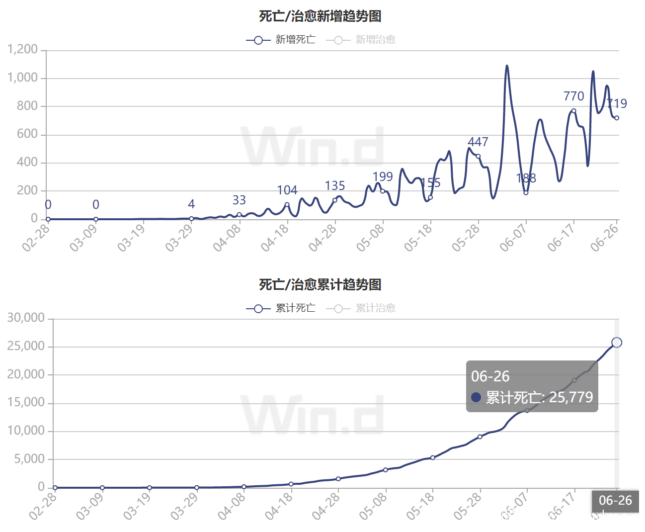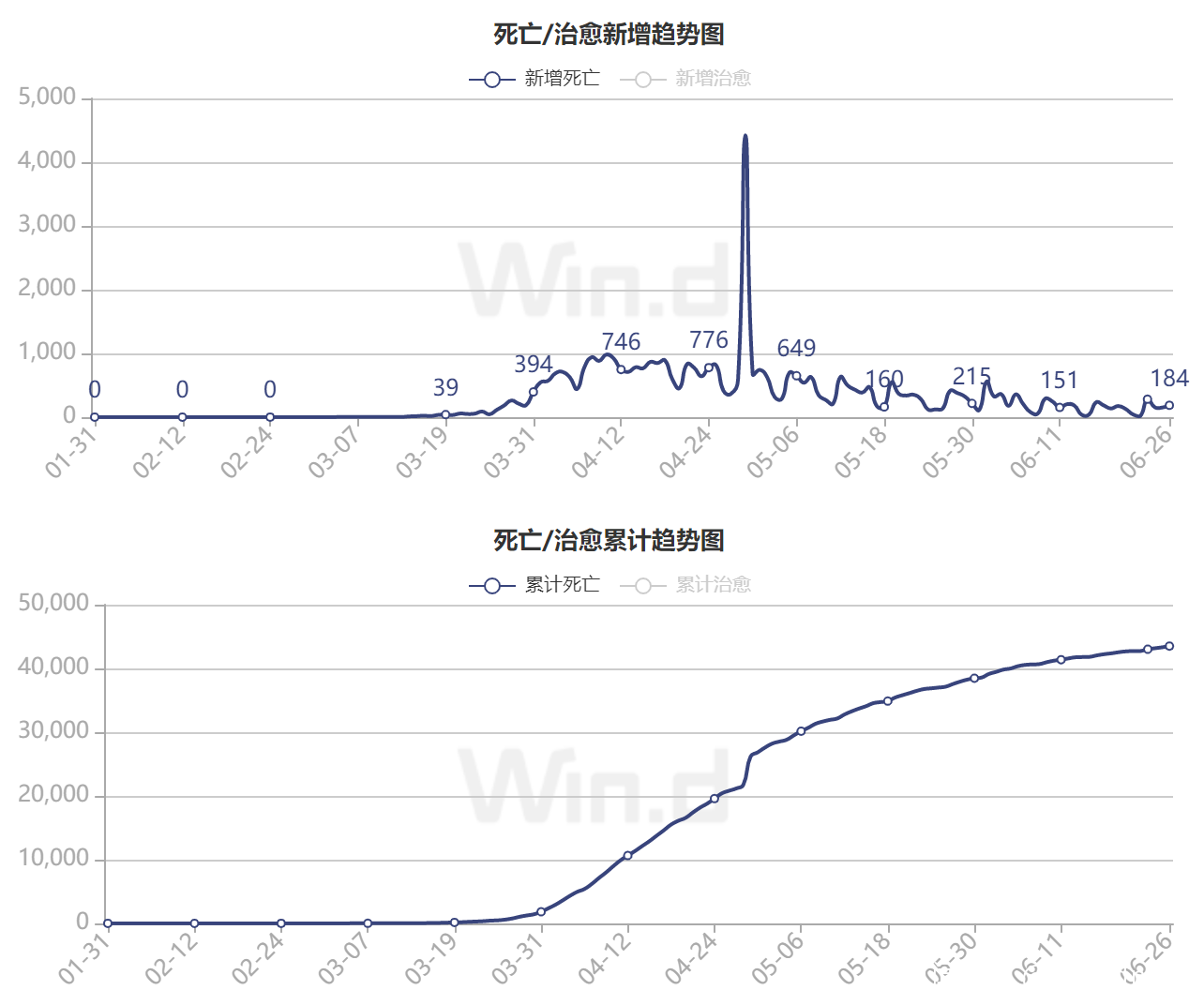 **法國(拐點確認):**新增病例數為1588例;累計確診162936例,環比增加0.98%;新增病亡26例;累計病亡29781 例,排全球第五位,僅次於美國、巴西、英國和意大利;病亡率****18.3%,高居百萬以上人口國家榜首。