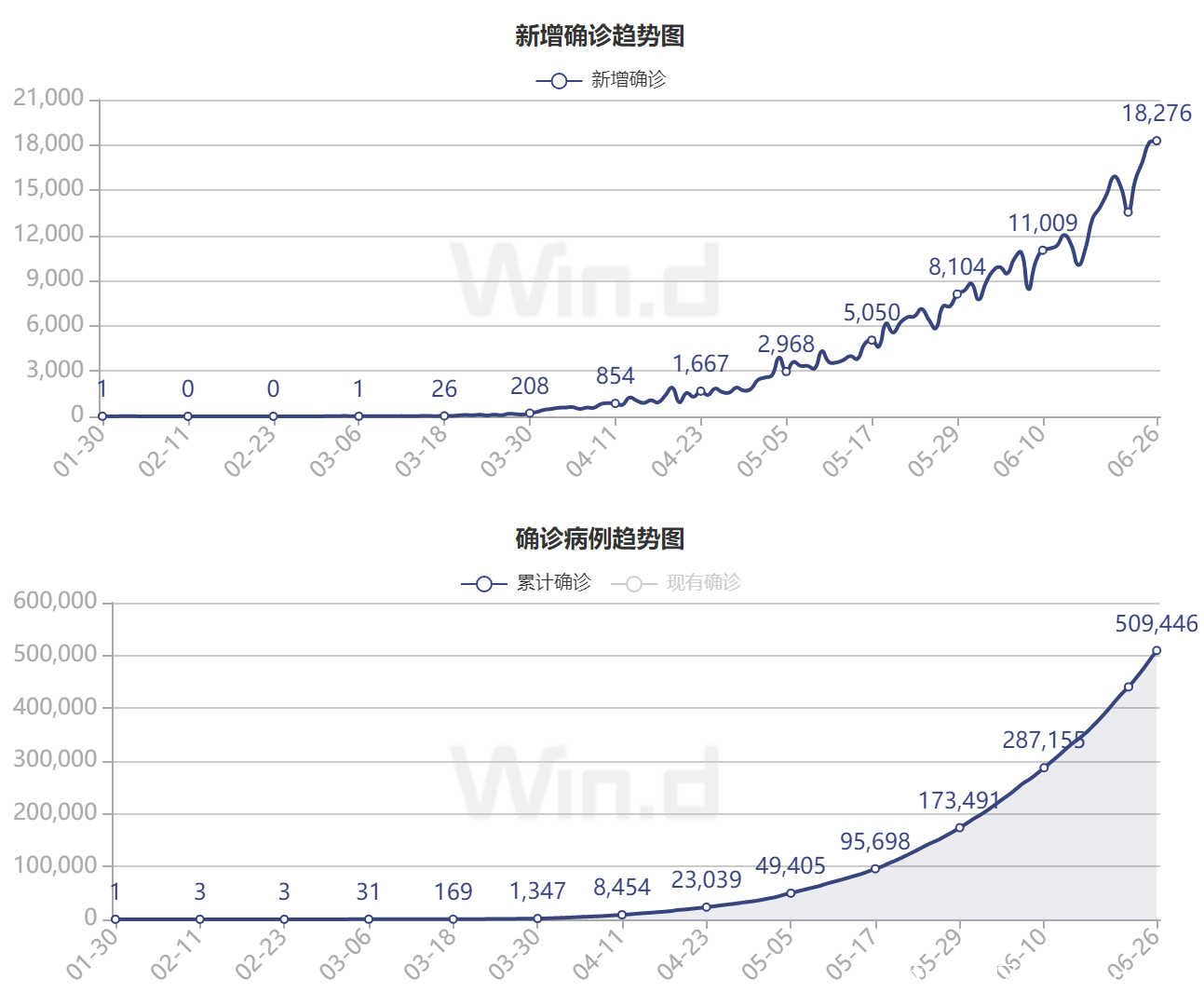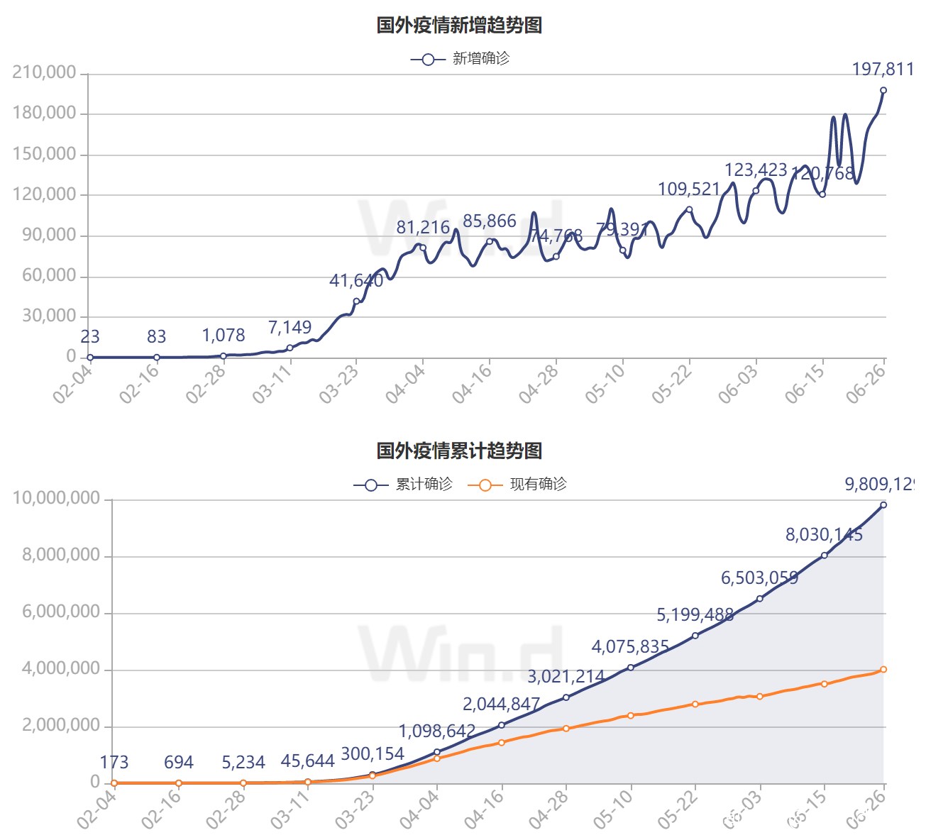6月26日,全球(除中國)新增確診197811例,連續第二天打破歷史記錄,環比增加9%,連續第五天增加;累計確診9809129例,環比增加1.9%;百萬人口確診1586例,是中國的115倍;新增病亡4485例;累計病亡491947例,環比增加0.9%;百萬人口死亡79.5例,是中國的106倍;粗病亡率5.02%,比中國低0.53個百分點,病亡率繼續下降。