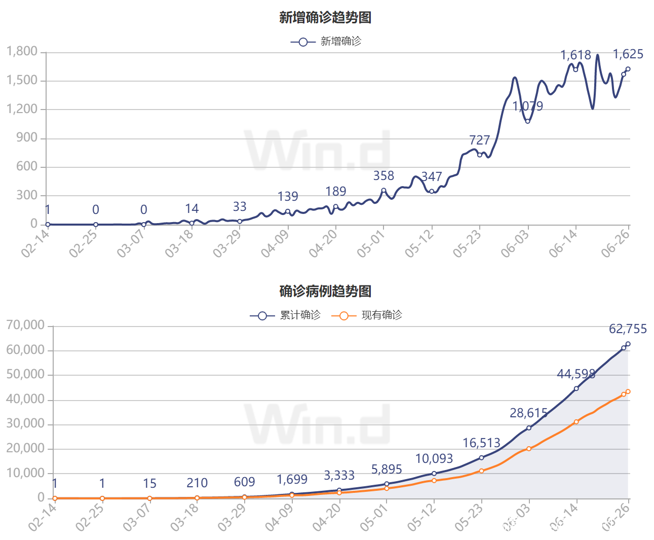 埃及(指數增長):新增1625****例,再創新高;累計62755例,環比增長2.7%;新增病亡87例;累計病亡2620例;病亡率為4.2%。埃及的疫情呈指數增長態勢。