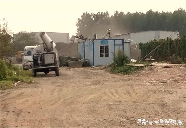 石子廠正在生產,塵土飛揚。三輪車上安裝的霧炮也沒有使用。