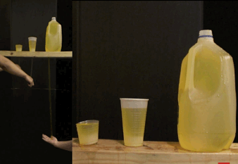 我們做了一個實驗,三個容器分別是代表一隻狗,一個人,和一頭犀牛的膀胱容積。在底下放了三根管子,代表這些動物的尿道。你看,體積不同,但是都有一樣的清空時間。