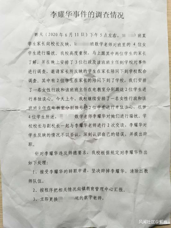 6月12日,多鳳小學向4位家長出具了一份《李耀華事件的調查情況》。根據校方的這份書面材料,該校校長蘇耀棠與另一位副校長與李耀華兩次交談,李耀華對學生反映的“騷擾”情況未予否認,“深刻認識自己的錯誤,並提出辭職”。