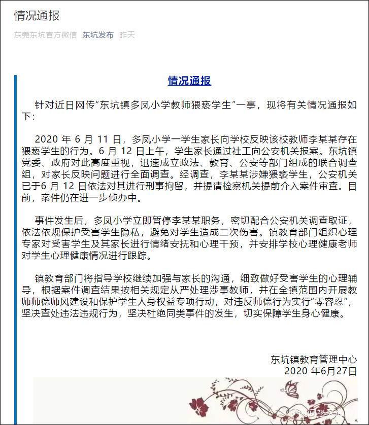 6月27日,東坑鎮教育管理中心通報稱,東坑鎮黨委、政府對此高度重視,成立政法、教育、公安等部門組成的聯合調查組,對家長反映問題進行全面調查。事件發生後,多鳳小學立即暫停涉事教師職務,配合公安機關調查取證,依法依規保護受害學生隱私,避免對學生造成二次傷害。鎮教育部門組織心理專家對受害學生及其家長進行情緒安撫和心理干預,並安排學校心理健康老師對學生心理健康情況進行跟蹤。