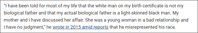 面對質疑,他回應稱自己出生證明上的人不是自己的父親,他的親生父親是一位膚色淺黑的黑人。