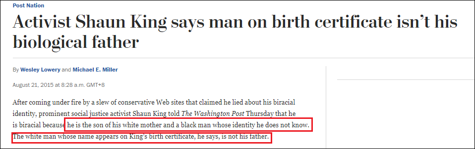 作為重要的“民權活動家”,肖恩長期以來宣稱自己是一個黑人。但早在2015年,就有媒體和自稱知情人士指責肖恩在種族和經歷上造假,@布賴特巴特新聞網 公開了其父親的身份信息,上面明確標註為白人。