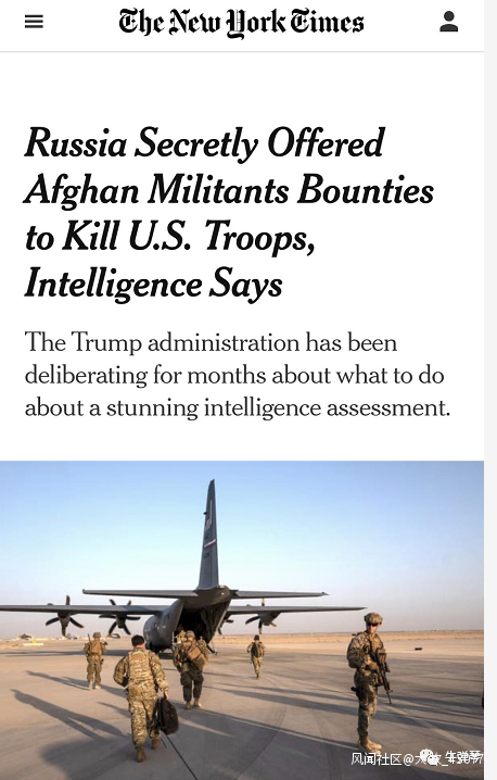 1,《紐約時報》最先披露,美國情報單位幾個月前就斷定:俄羅斯軍情部門向阿富汗塔利班關聯組織秘密提供賞金,鼓勵他們擊殺美軍和其他聯軍。